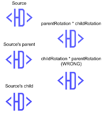 When combining rotations, a parent GameObject may rotate the parent and a child, and then the child could add an additional rotation of its own. With Quaternions, you write the multiplication such that the parent comes before the child. Order matters, as shown in this example:
