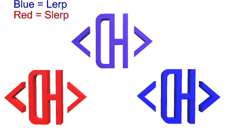 The following example shows two objects, one which is rotating with Lerp (blue) and the other with Slerp (red). Note that they exactly the same at the start, middle, and end; and there is very little different in between.